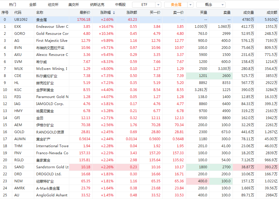周二美国白银股普遍上涨,全球第二大原银生产商泛美白银 (NASDAQ:PAAS)上涨3.92%,报37.08美元;赫克拉矿业 (NYSE:HL)上涨6.61%,报5.16美元。日内现货白银涨幅扩大到6.44%,创2014年7月以来新高至21.19美元/盎司。