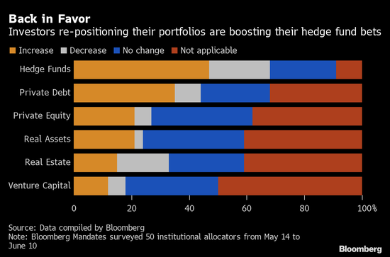 几乎一半的机构投资者重新调整投资组合,已经增持或计划今年增持对冲基金。在六种主要替代资产类别中,对冲基金成为首选,其次是私人债务。大约60%的受访者表示是因为市场动荡而重新调整投资。