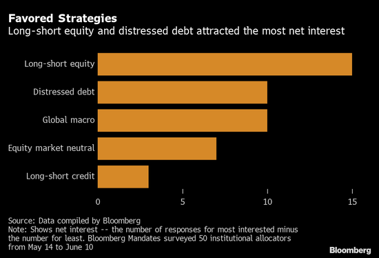 多空股票是最受欢迎的对冲基金策略,其次是不良债务和全球宏观。投资者对基金中的基金(FOF)兴趣最低。