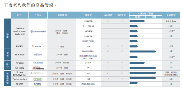 该公司在欧美四个城市设有见识广阔及经验丰富的业务开发团队,其已与全球的生物制药公司建立强大的关系,并有系统地在各重点治疗领域中筛选及评估具差异化、处于后期、已规避风险,且相信在大中华及其他亚太新兴市场有重大商业潜力的资产。严谨及主动地识别及选择新增候选药物是该公司增长策略的中心。