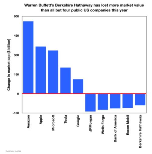 因为新冠疫情,今年巴菲特旗下的伯克希尔哈撒韦公司(Berkshire Hathaway)受到的冲击,可能比任何其他美股上市公司都要大。截至目前,伯克希尔哈撒韦市值蒸发约900亿美元,股价已经累计下跌了16%以上,而位居榜首的特斯拉同期股价则上涨了将近300%。