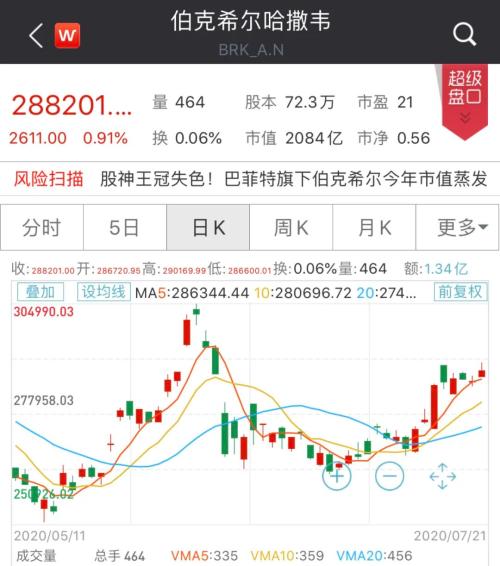 受新冠疫情影响,伯克希尔股价今年下跌了16%,市值减少了约900亿美元(至约4600亿美元),市值蒸发规模在美股所有上市公司中排名第五,前四名分别为摩根大通、富国银行、美国银行和埃克森美孚,其市值损失在1100亿至1400亿美元之间。