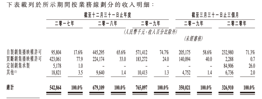 若以收入计算,则公司的核心收入仍然来自自制剧集业务,该业务2019年营收占比为74.7%。