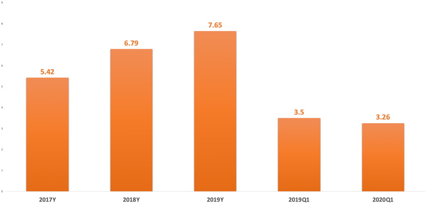 此外,值得注意的是公司的现金储备状况不佳,2020Q1现金等价物不足1亿元,而流动负债总额为13.87亿元,速动比例持续下滑,公司资金相对紧张。