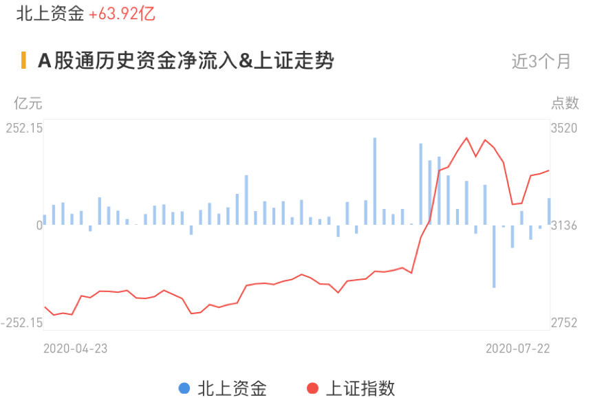 华盛资讯7月21日讯,南下资金今日净流入42.75亿港元,流入规模较上一交易日有所减少。北上资金大幅流入A股63.92亿元,由净流出转为净流入。