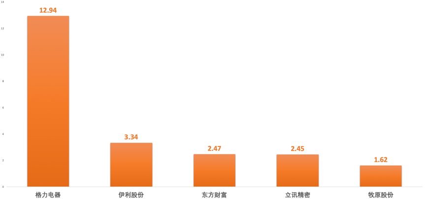 北上资金今日净买入格力电器12.94亿元,净买入伊利股份3.34亿元,净买入东方财富2.47亿元,净买入立讯精密2.45亿元,净买入牧原股份1.62亿元。