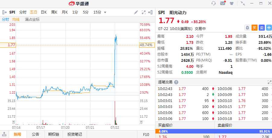 华盛资讯7月22日讯,阳光动力(SPI)暴涨38.28%,现报1.77美元,总市值2626万美元。7月15日,该公司股价已重新符合不低于1美元上市规则,重新符合纳斯达克上市规则。