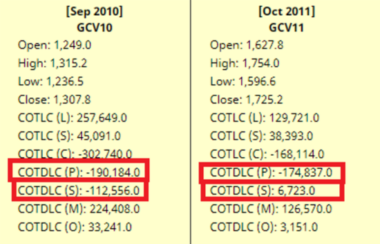在当时,黄金银行掉期头寸规模从净空仓112556手变为净多仓6723手。这些掉期合约的变化,是空头在不断上涨的黄金市场上回补名义空头头寸的证据,截至2011年9月底,金价创下历史新高。