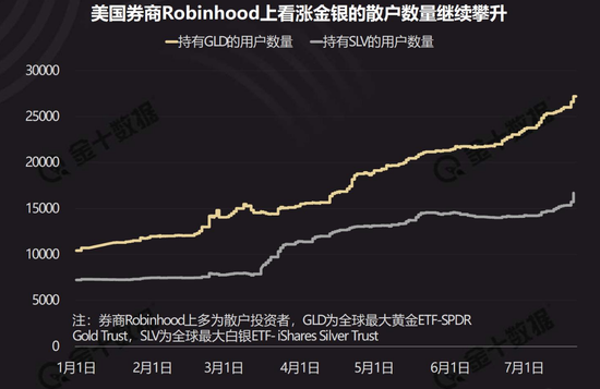 第一类是散户。说到这点,我们可以看一个有趣的数据。自3月份触底反弹以来,美国券商Robinhood在线平台上看涨黄金的散户就越来越多。GLD(全球最大黄金ETF)和SIV(全球最大白银ETF)的持仓规模也节节上升。随着投资门槛降低,更多的散户通过各种渠道参与黄金市场的逐利游戏,进而推高金价——就如同他们推高美国股市一样。