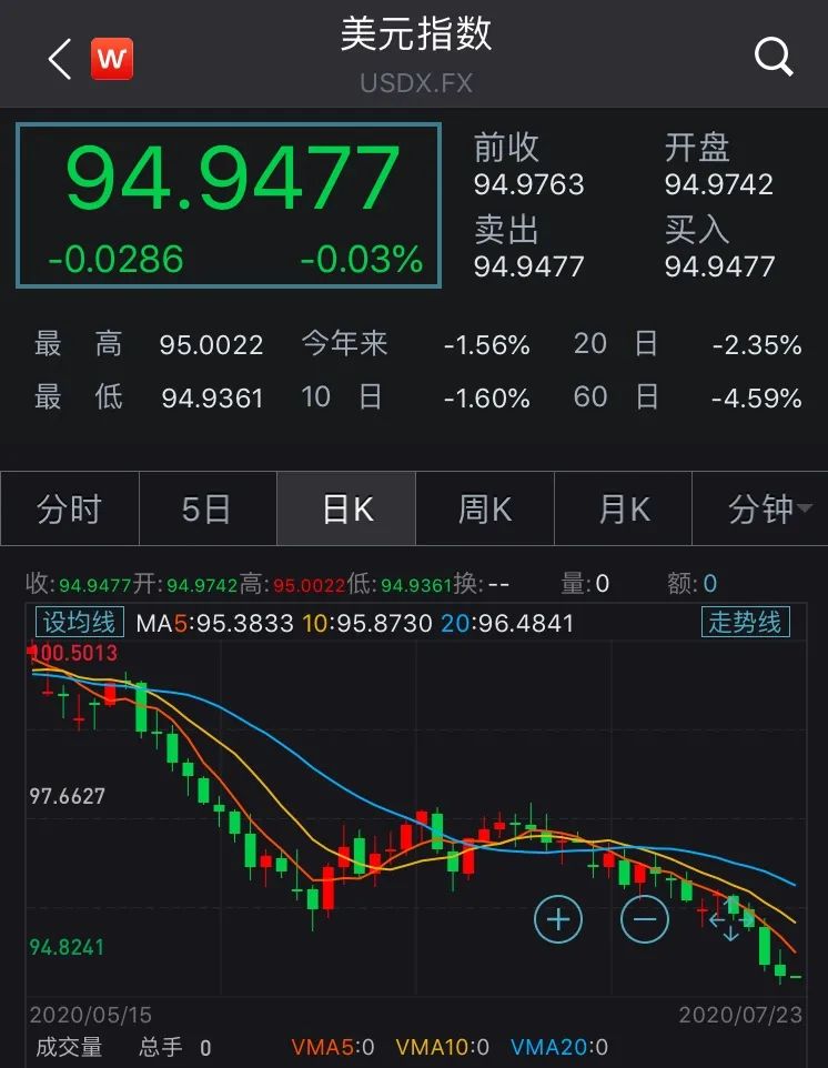 近期美元指数表现得相当“落魄”,美元指数徘徊在95附近,7月22日盘中一度跌至94.8241,创下4个月来新低。