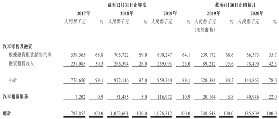 从收入构成来看,汽车零售及融资服务2017年至2019年的收入占比分别为99.1%、95.0%和89.1%;其中根据融资租赁销售汽车的占比超过6成。