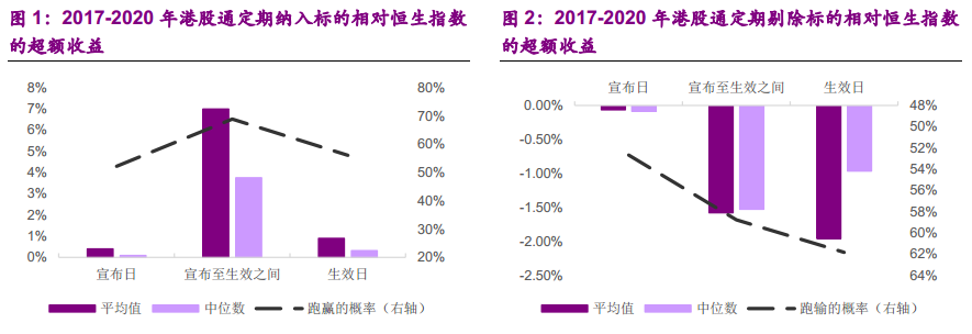 通过2017年至2020年港股通数据统计来看,自恒生公司公布恒生综指新的成分股变化日到正式生效日之间,新纳入的公司跑赢恒指获得超额收益的概率为68.89%,平均上涨的幅度为6.99%。