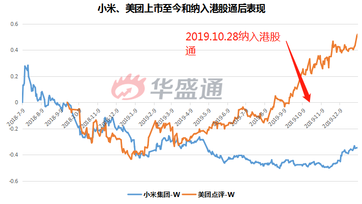 像在2019年10月28日,港股市场两大科技巨头小米集团和美团点评在被纳入港股通名单以后,股价就走出了一波上涨的行情。