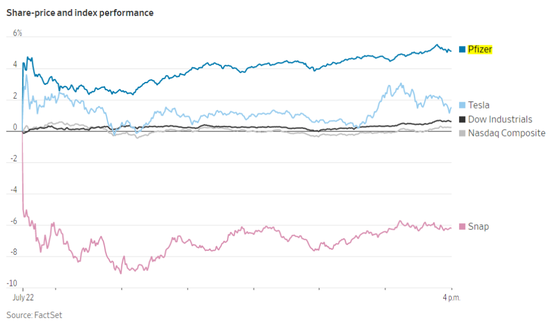周三,美国签署20亿美元协议,购买辉瑞和BioNTech SE联合开发的实验性新冠疫苗,辉瑞制药 (Pfizer) 股价上涨4.9%,提振了道琼斯工业平均指数。