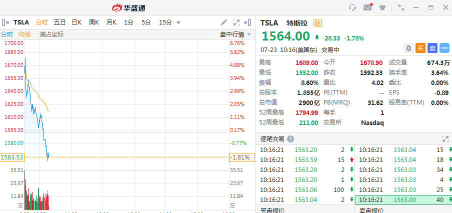 华盛资讯7月23日讯,周四美股盘初,特斯拉(TSLA)一度跳水跌2%。特斯拉二季度营收60.4亿美元,较去年同期的63.50亿美元下滑4.9%,但高于市场预期的54亿美元。截至发稿该股已翻红涨0.3%。