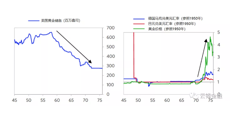 1945年之后,外国央行可以选择持有附息债务或持有无息的黄金。因为美元计价的债务被认为和黄金一样有吸引力,美元债务能够兑换成黄金,还可以给予持有人黄金所没有的利息,所以从1945年到1971年,央行减少了黄金储备,增加了美元债务的持有。投资者采取这样的转变是一个经典的行为,并直到以下情况下才停止:a) 对真实货币(如黄金)的债权大大超过银行拥有的货币规模并且 b) 银行持有的真实货币(如黄金储备)数量在下降。那时候,没有利息高到可以让投资者愿意持有债务而放弃将纸币兑换成黄金。因此,银行挤兑发生了,违约和债务重组也随之发生,这也是导致与黄金挂钩的布雷顿森林体系崩溃的原因。