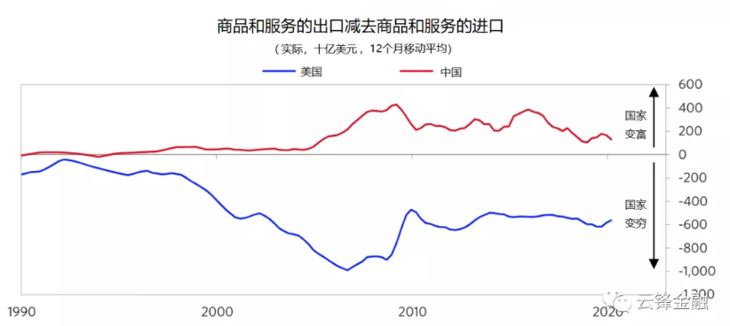 1991年8月6日,互联网和技术开始蓬勃发展;1995年1月1日,世界贸易组织成立。从上世纪90年代到2016年特朗普当选总统前,科技发展和全球化取代了很多美国工人的工作,尤其是制造业的工作。这些劳动力密集型行业开始向新兴国家倾斜,这加速国家之间的人口流动,缩小了国与国之间的贫富差距。 从1990年以来的美国和中国货物和服务实际差额可以看出,中国经济在1978年改革开放以及2001年加入世贸组织两个节点增长迅速。本世纪初到2010年,中国的贸易顺差和美国的贸易逆差加速增长。之后,两国的贸易余额逐渐缩小,中国仍然趋向于贸易顺差,而美国仍然是贸易逆差。