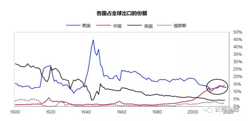 Dalio意识到这与1933年3月罗斯福新政、1971年8月尼克松总统在任时的举动、沃尔克在1982年8月推出的货币政策、2008年11月伯南克的直升机撒钱、德拉吉在2012年7月实行的宽松都是一样的,这已成为央行的标准操作程序。 Dalio也在他之前的文章中解释过,对于所有单位,包括个人、公司、非盈利组织和地方政府来说,当收入大于支出时,净资产增加,也会导致资产相对于负债上升,在其他条件不变的情况下,这会增加净储蓄。 对于国家来说,出口是主要收入来源。在两次世界大战期间,美国出口飙升而英国出口骤降:英国出口从1900年约占全球总出口的30%下降到了今天的不到5%;而美国出口直到2000年左右相对稳定在20%至25%之间。2000年后,中国出口从约5%上升到目前的15%左右,美国的出口下降到全球的14%左右。