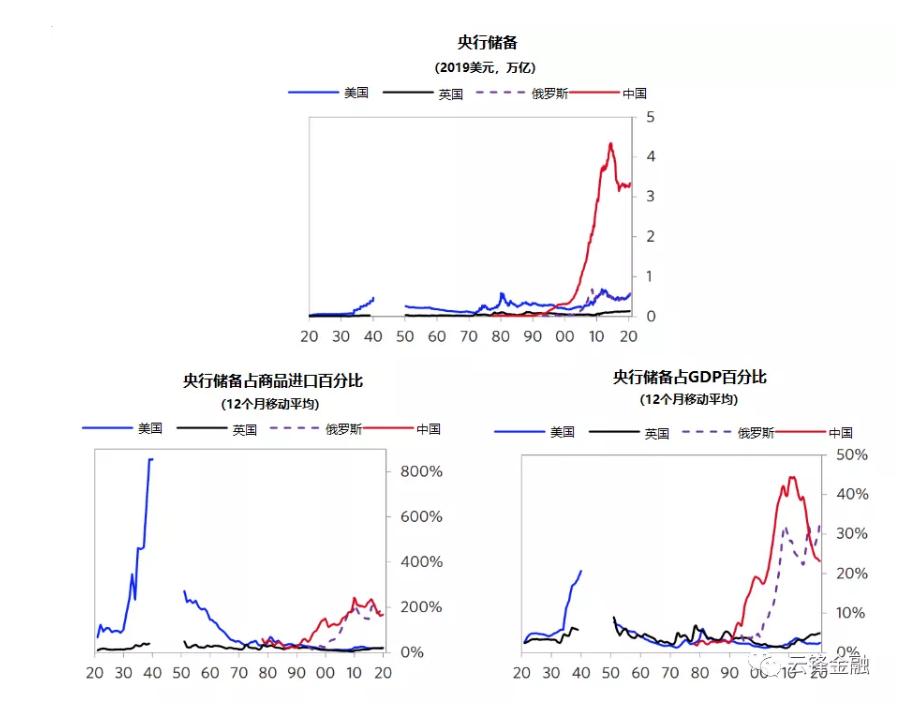 美国和英国的外汇储备约为70天进口规模,而俄罗斯和中国的外汇储备分别约为700天和600天进口规模。