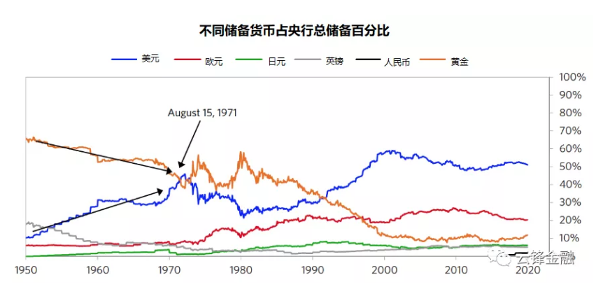 黄金在总储备中所占的份额已从1945年的65%降至约10%。美元贬值和金价飙升导致黄金在央行储备中的份额在20世纪90年代初之前一直比重最高,但是之后它在世界储备中的份额下降到只有10%。 美元占外汇储备比例在50%以上。自1945年以来,美元的主要储备货币的地位一直相当稳固,特别是在向法定货币体系转变后,美元取代黄金成为持有最多的储备资产。 自1970年代末以来,欧元在全球储备货币中的占比一直稳定在20-25%,而日元和英镑在5%左右,而人民币仅为2%,远低于其在世界贸易和世界经济规模中的分量。 美元的地位已经和美国经济实力不匹配了,美元地位变化有时滞,美国经济实力在降低,但美元地位依旧很稳固。这意味着,