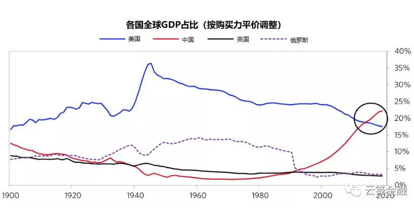 1945年美国的总产出是其他主要国家的数倍,尽管其在全球的占比有所下降,但仍远高于其他任何国家,直到最近美国才被中国超过。按非购买力平价计算,中国的总产出约为美国的70%,而且增速明显加快。最重要的是,美国在1945年是主要的经济生产国,在过去的100年里没有一个经济竞争对手,直到现在中国已经与美国规模相当。