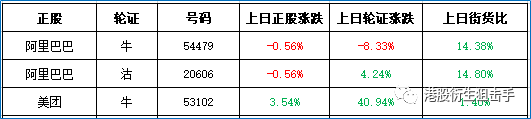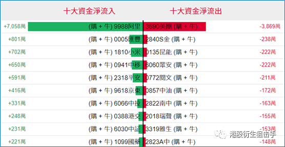 好仓(认购证及牛证)方面,有7058万、801万港元资金分别净流入阿里、汇丰部署造多,而有3869万港元资金净流出美团套现。