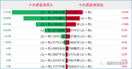 淡仓(认沽证及熊证)方面,有774万、608万港元分别净流入美团、腾讯部署空单,而有少量资金净流出汇丰、阿里获利。