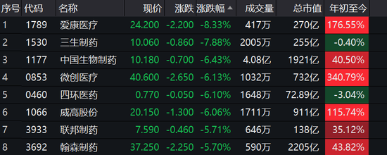 医药股领跌,其中,爱康医疗跌8.33%,三生制药跌8%,中国生物制药跌6.4%,微创医疗跌6%。