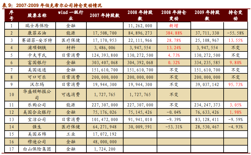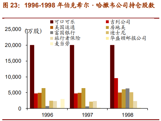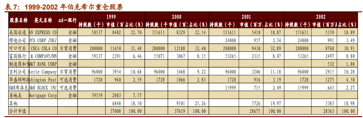 亚洲金融危机期间,伯克希尔所持重仓股主要分布在金融、日常消费、可选消费行业。在1998 年,伯克希尔对消费、金融行业大幅增持,分别增持金融股富国银行、可选消费股迪士尼、日常消费股吉列公司股票 89.48%、57.89%、50.00%。