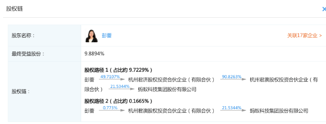 20多年前,彭蕾加入阿里从HR做起,一路做到CPO,并于2010年临危接任支付宝CEO,最终一手打造了这个巨无霸。经过层层计算,彭蕾的最终受益股份达到9.89%,高于马云持股的8.8%。按照蚂蚁集团市值2000亿美元(约合1.4万亿人民币)计算,彭蕾持有的市值约为人民币1385亿元。