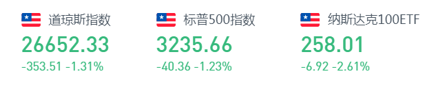 周四,美国上周新申领失业救济人数近4个月来首次上升,投资者担心新一轮卫生事件进一步打击就业市场及经济,拖累美股市场气氛。美股低开,盘中在科技股拖累下,道指一度跌超400点。截至收盘,道琼斯指数跌353.51点,跌幅1.31%,报26652.33点;标普500指数跌39.92点,跌幅1.22%,报3236.10点;纳斯达克综合指数跌244.71点,跌幅2.29%,报10461.42点。