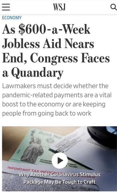24日消息,3月出台的《关怀法案》中的多项疫情救助措施也即将到期,特别是对失业人群至关重要的每周600美元联邦补助将于7月底停止发放,《纽约时报》则估计,将有超过2000万美国人可能因此收入减半。