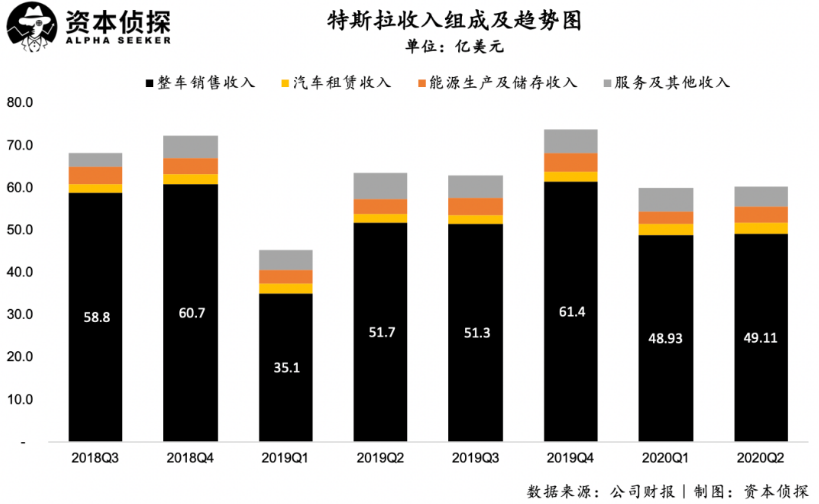 营收方面,特斯拉第二季度实现营业收入60.36亿美元,同比下滑5%,环比上涨1%。其中,整车销售收入为49.11亿美元,在收入规模、占比方面同比、环比都未出现明显变化。在疫情期间全球车市大疲软的背景下,特斯拉维持了一贯的营收水平,已经印证了其较强的抗风险能力。