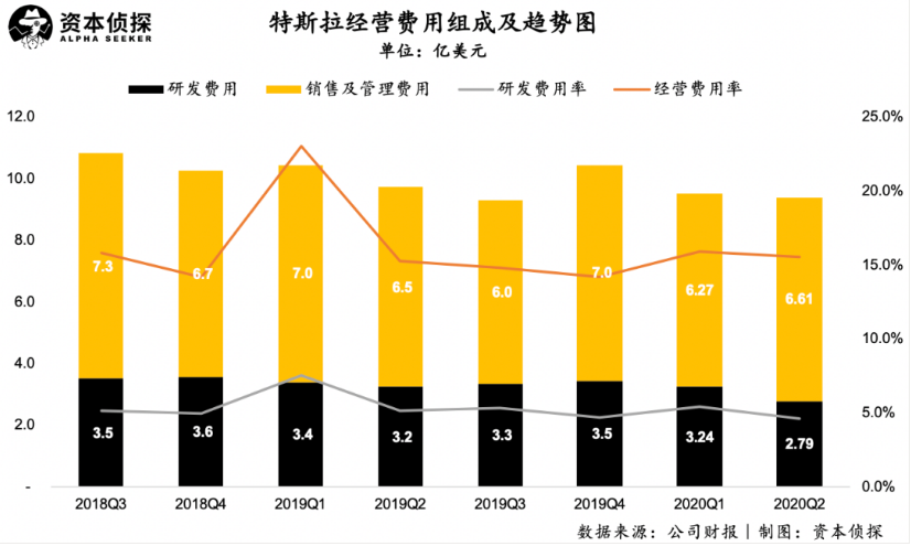 费用方面,特斯拉在疫情期间进一步压缩了研发费用,连续两个季度研发费用都出现环比下降,但销售管理费用出现了2%的同比上升。经营费用率处于近一年中的较高水平,并未在疫情期间严格控制成本。