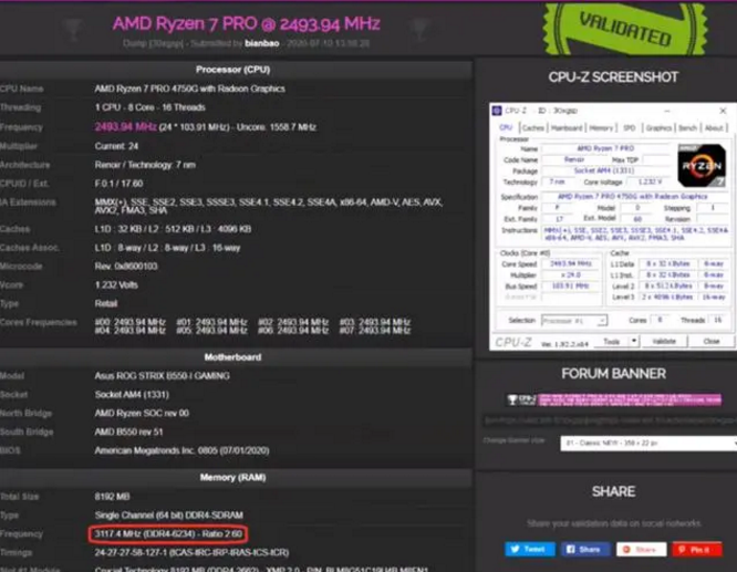 虽然DIY用户想无法在近期单独购买AMD Ryzen 4000G系列APU,但厂商们依然在不遗余力地宣传AMD这一代APU的强势。之前已经有人把Ryzen 7 4700G这颗APU超到全核4.75GHz以上,展现了APU不俗的超频性能;现在华硕也跑出来凑热闹,在自家的B550主板上,使用Ryzen 7 Pro 4750G将DDR4内存超到了6234MHz,这也正式打破了AMD平台上最高内存频率的记录。