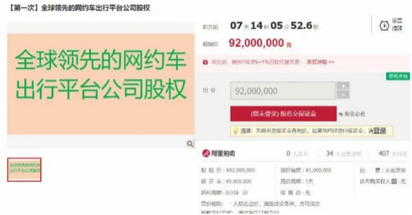 7月21日,阿里拍卖网站显示有名为“全球领先的网约车出行平台公司股权”的项目将被拍卖。起拍价为9200万元,竞价时间为7月29日,竞价周期为1天。