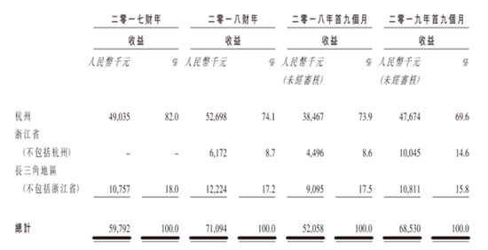 而在区域分布上,宋都服务还是紧守以杭州为首的大本营。截至2019年9月,宋都服务在杭州的在管建筑面积为280.7万平米,占总在管建筑面积的71%;去年头9月来自杭州的收入为4767.4万元,是当期总收益的69.6%。如若算上浙江其他地市,浙江单省在管面积与收入占比分别达到79.8%及84.3%。