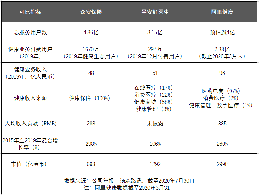从用户规模来看,截至2020年7月3日,众安在线总服务用户数已远超平安好医生和阿里健康,达到4.86亿人,而平安好医生则仅为3.15亿人。