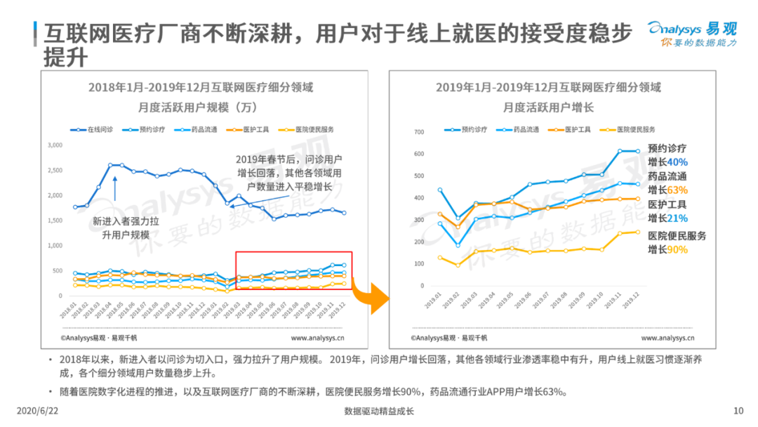 易观数据显示,2019年线上在线问诊月度活跃用户规模保持在1500万以上,预约诊疗、药品流通、医护工具、医院便民服务月度用户增长分别为40%、63%、21%和90%。