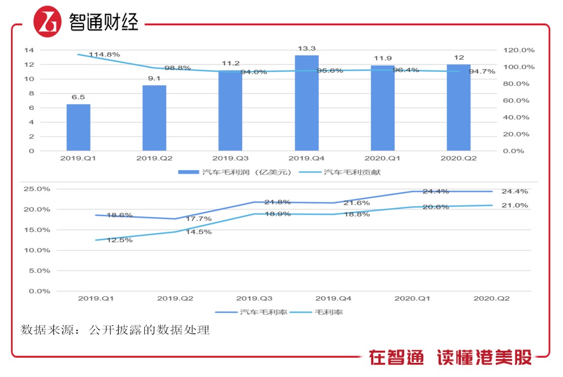 特斯拉持续实现盈利是投资者关注焦点,该公司毛利率稳定增长,2020年Q2为21%,同比提升了6.5个百分点,其中汽车销售毛利率24.4%,同比提升6.7个百分点,贡献毛利润为94.7%。在其他业务中,除了服务业务,汽车租赁和能源生产及储存业务在往季均实现正毛利润。