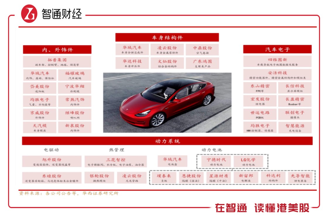 特斯拉产业链各供应商主要分布于A股,港股分布比较少,比如赣锋锂业(01772),主要供应电池上游原材料氢氧化锂,福耀玻璃(03606),为车窗侧玻璃供应商,均是特斯拉上游直接利益相关的企业。