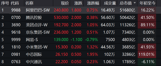 恒生科技指数正式出炉,科技股集体反弹,恒腾网络涨2.4%,汇付天下、中芯国际涨2%,阿里巴巴涨0.75%,腾讯涨0.38%,美团涨超1%,小米涨1.32%。