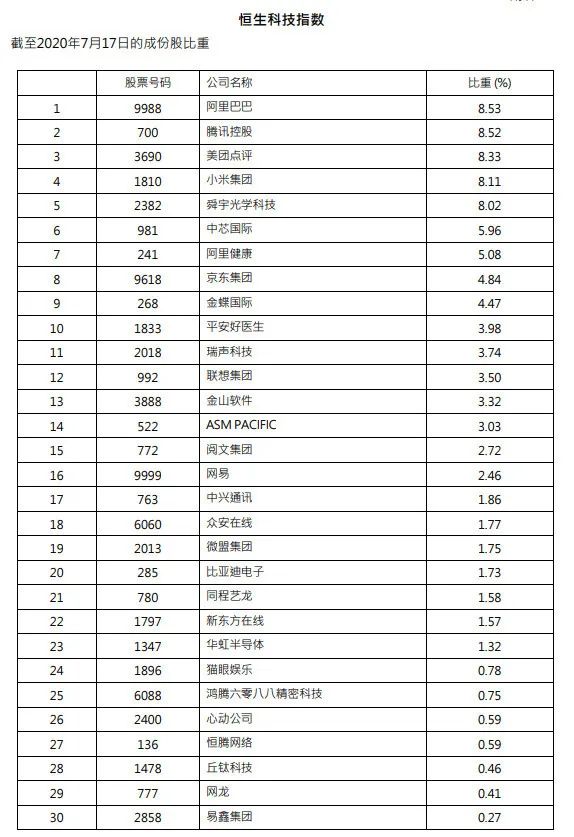 恒生指数公司宣布将于今日(7月27日)推出恒生科技指数。新指数将追踪港股市场市值最大的30家科技企业,几乎都是清一色的中资科技企业,堪称"港版纳斯达克指数"。