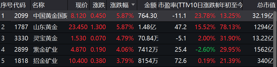 山东黄金、中国黄金国际涨5.87%,灵宝黄金涨4.8%,紫金矿业、招金矿业涨4%,周大福涨1.5%。