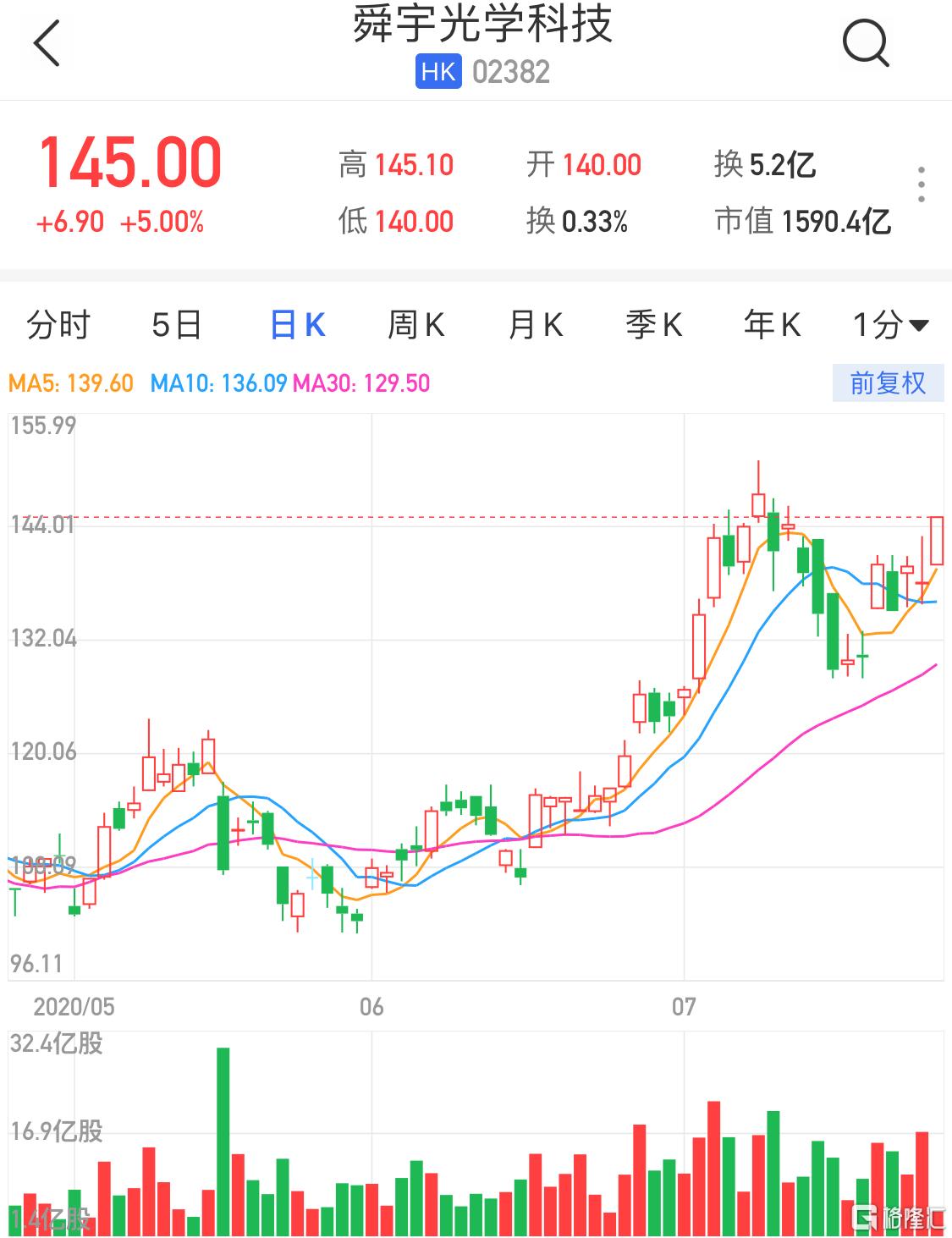 舜宇光学(02382.HK)现涨5%为最佳恒指成份股,报145港元,暂成交5.2亿港元,最新总市值1590亿港元。