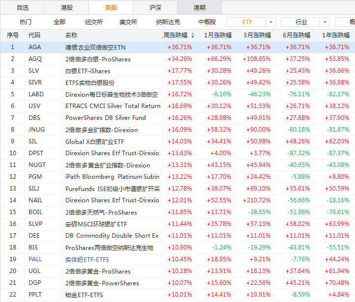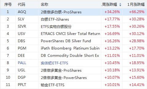受白银大涨刺激,上周做多白银ETF牢牢占据了美股ETF涨幅榜的前3位。排名第一的AGQ是2倍杠杆做多白银的一只ETF,上周涨幅高达34.26%,近1个月的涨幅则超过66%,近几周屡屡上榜。