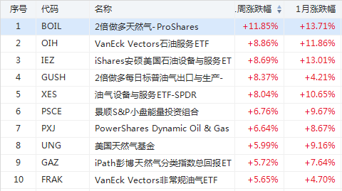 由于涨幅较低,上周直接跟踪油价的ETF依然排除在涨幅榜前十以外,反倒是做多石油服务企业的ETF多只上榜;而天然气也再次成为能源榜中的佼佼者,2倍做多天然气的BOIL周涨近12%。