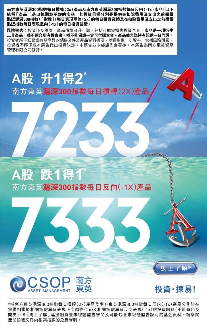 今日香港市场新迎来2只杠杆和反向追踪沪深300指数的ETF:2倍做多沪深300指数的XL二南方沪深三(7233.HK)和一倍做空沪深300指数的XI南方沪深三百(7333.HK)。