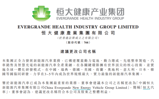 恒大健康公布,鉴于新能源汽车已成为本集团最重要的业务,董事会建议本公司之名称更改为‘中国恒大新能源汽车集团有限公司China Evergrande New Energy Vehicle Group Limited’,简称‘恒大汽车’。