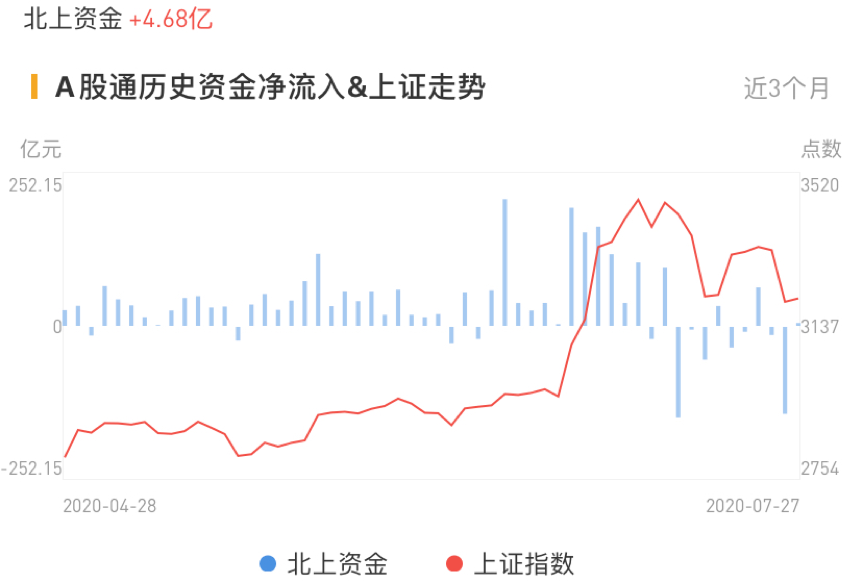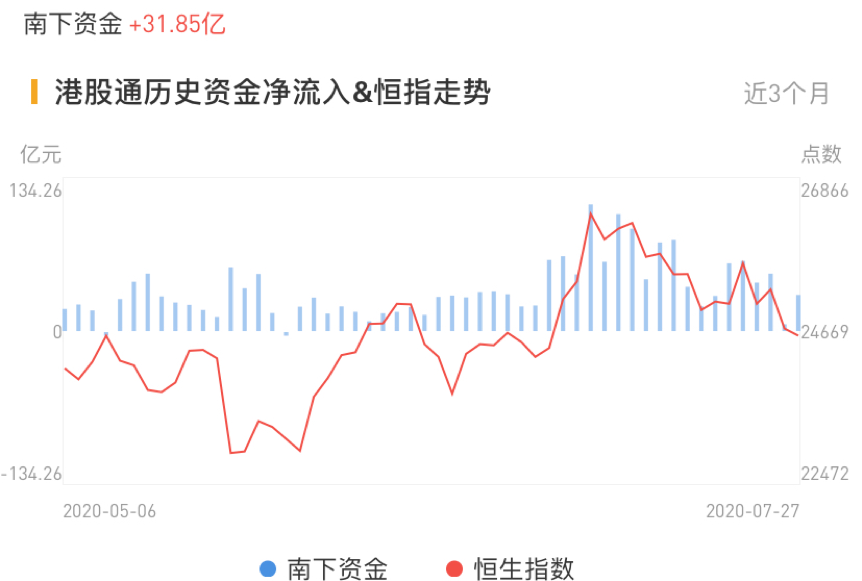 华盛资讯7月27日讯,南下资金今日净流入港股31.85亿港元,流入趋势由净流出转为净流入,但较前期规模仍较低。北上资金小幅流入A股4.68亿元,由大幅净流出转为小幅净流入。